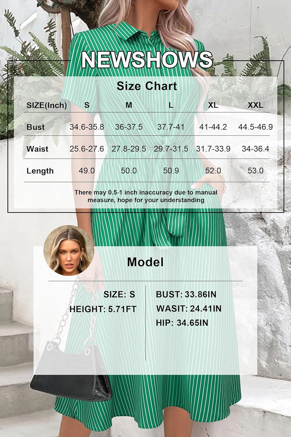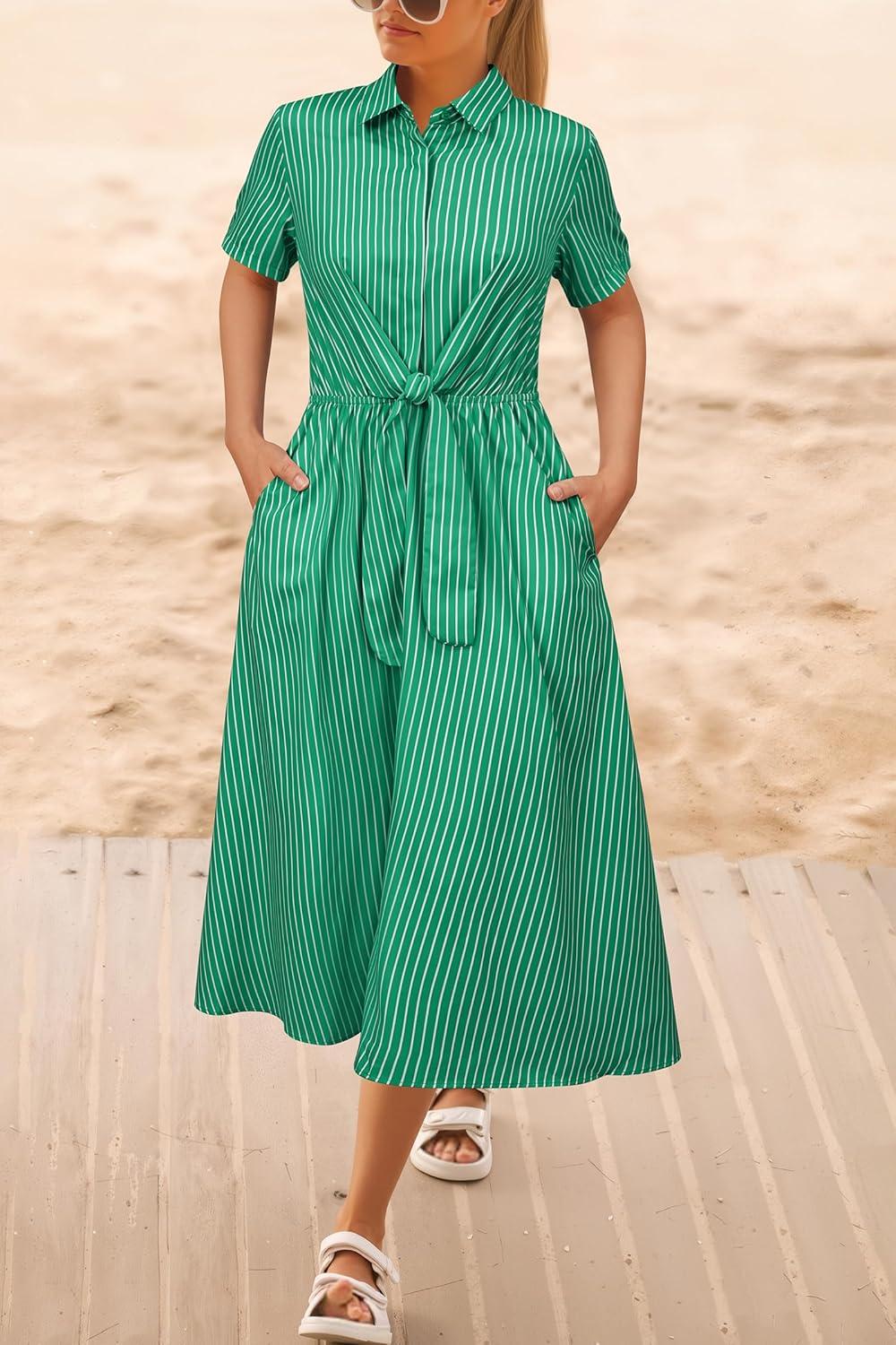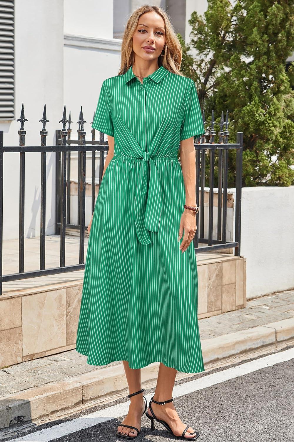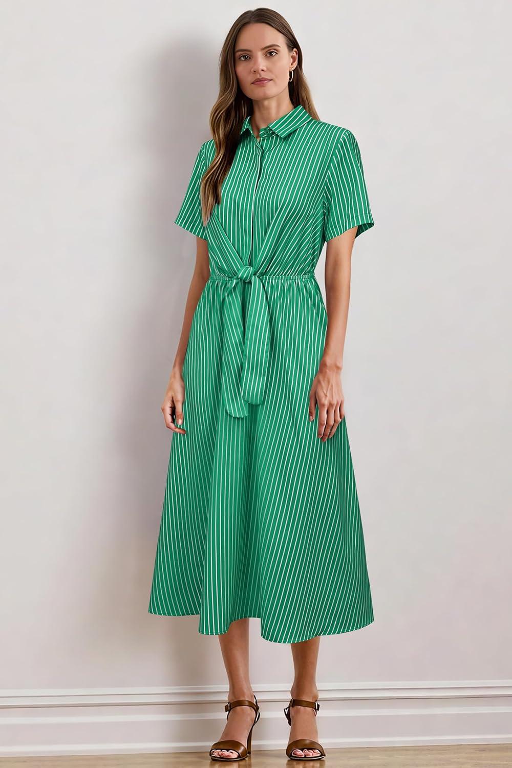 Newshows Womens Wear to Work Teacher Business Casual Outfits Long Dresses Tie Waist Shirt Dress Attire with Pockets(Green White Striped)
