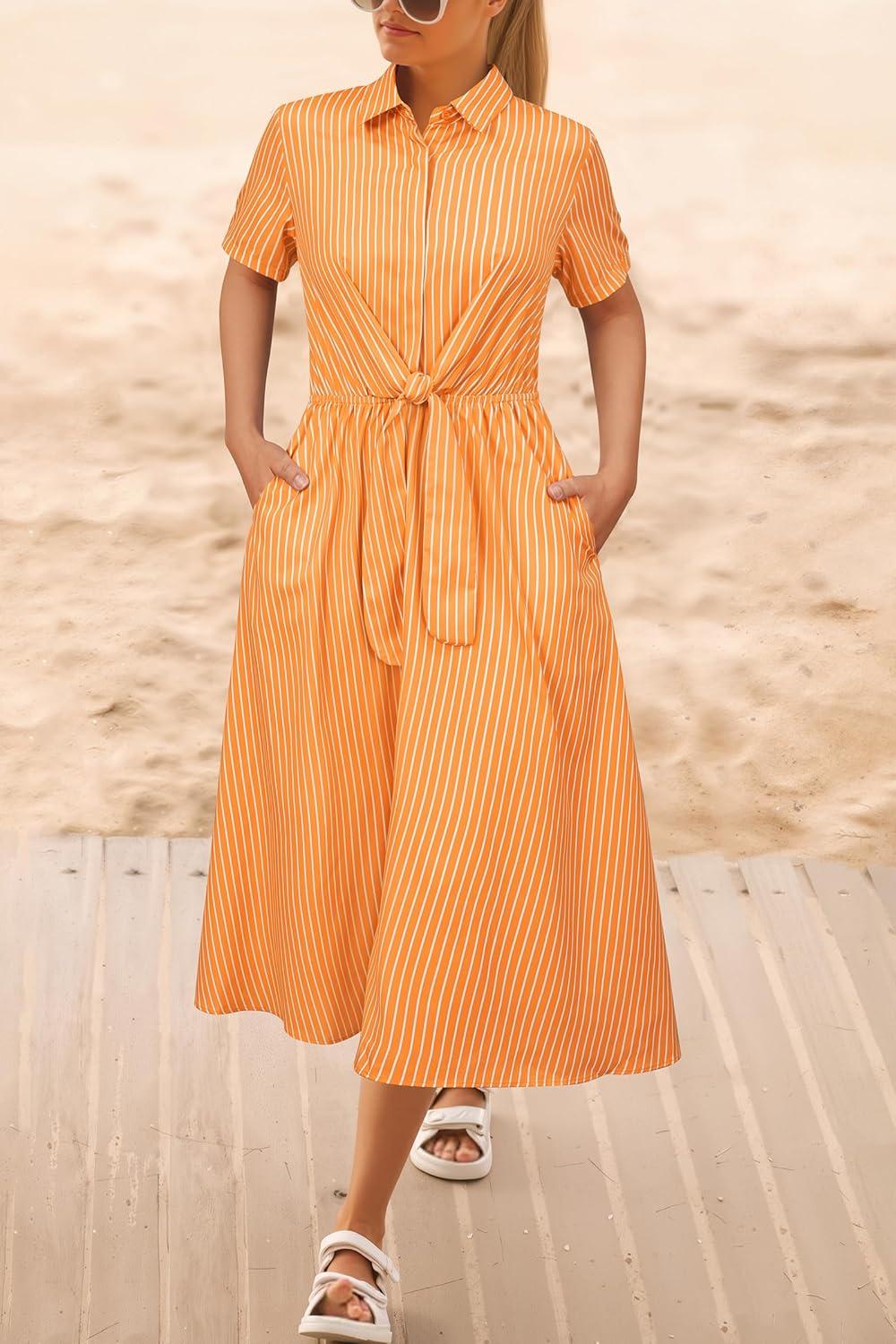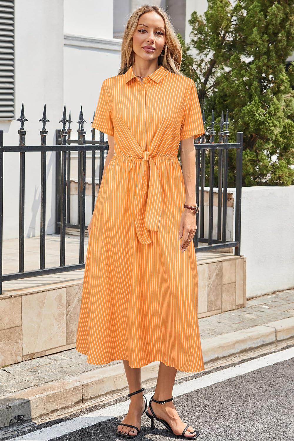 Newshows Womens Wear to Work Teacher Business Casual Outfits Long Dresses Tie Waist Shirt Dress Attire with Pockets(Orange White Striped)