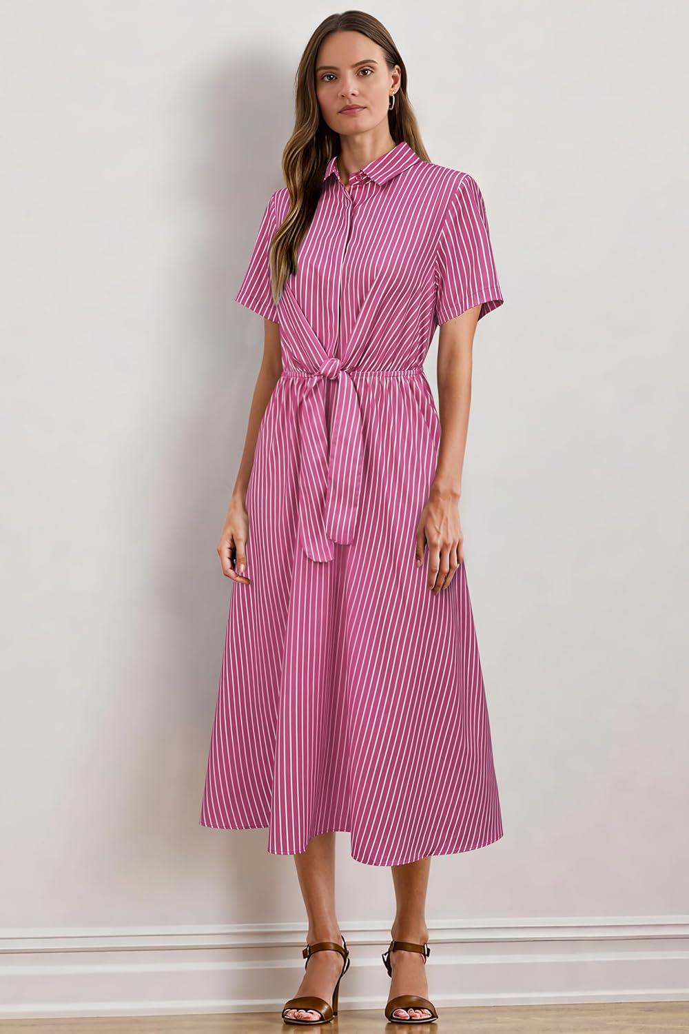 Newshows Womens Wear to Work Teacher Business Casual Outfits Long Dresses Tie Waist Shirt Dress Attire with Pockets(Rose White Striped)